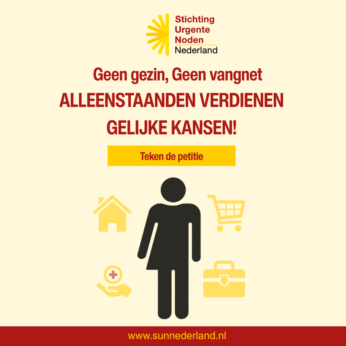 Eén op de vijf volwassenen in Nederland is alleenstaand (bron: Centraal Bureau voor de Statistiek). Uit de data van noodhulpbureaus komt naar voren dat 60% van alle noodhulpaanvragen voor alleenstaanden zonder kinderen wordt gedaan. In grote steden zien we dat dit percentage nog hoger ligt. Alleenstaanden hebben in veel gevallen maar één inkomen en moeten vaak onevenredig meer kosten betalen dan tweeverdieners, terwijl zij tegelijkertijd in aanmerking komen voor minder toeslagen dan huishoudens met kinderen. Hierdoor hebben zij een grotere kans op urgente noden en problematische schulden. Om aandacht te vragen voor deze vaak vergeten doelgroep in beleid start SUN Nederland samen met noodhulpbureaus deze campagne. Met deze petitie willen wij de onderhandelaars van het formatieproces en alle volksvertegenwoordigers vragen om extra aandacht te hebben en maatregelen te treffen voor de financieel kwetsbare positie van alleenstaanden. Doe met ons mee!